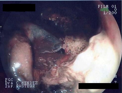 El día del ingreso presenta hemorragia digestiva alta con repercusión hemodinámica y anemia clínica, con hemoglobina de 8.7 g/dl y hematocrito de 25.6%. Se le repone con infusión intravenosa de cristaloides y un concentrado de glóbulos rojos, estabilizándose el paciente y solicitándose fibrogastroscopía de urgencia que evidencia lesión ulcerada subcardial de bordes irregulares, cubierta por coágulos y material necrótico (ver imagen 1).