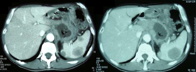 Imagen 2: Imágenes de la tomografía computerizada en la que se observa el extenso proceso que infiltra la curvatura menor gástrica y se extiende al retroperitoneo, así como las imágenes nodulares hipodensas esplénicas.