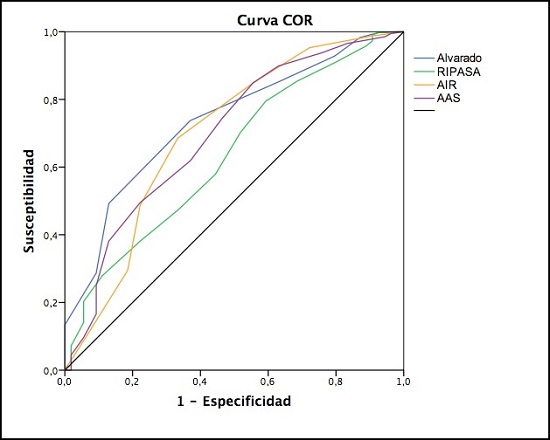 Figura 1. Curvas COR de las escalas a estudio para predecir el diagnóstico de AA.