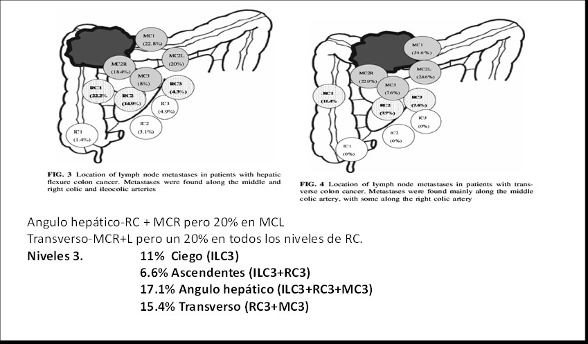 Los estudios reflejan que, en los tumores de ciego y colon ascendente, la mayoría de las metástasis linfáticas se encuentra en los niveles 1 de la arteria ILCA, algunas en los niveles 2 y casi ninguna en los niveles 3. En los tumores de ángulo hepático, la variabilidad en el drenaje linfático es mayor, apareciendo implicados casi por igual los niveles 1 y 2 de las arterias RCA y MCA, tanto en su rama derecha como en su rama izquierda. Por último, los tumores de colon transverso puro afectan por igual a los territorios MC1 y MC2, tanto en su vertiente derecha como izquierda, con afectación de sólo el 7 % en los territorios 3 de RCA y MCA1.
