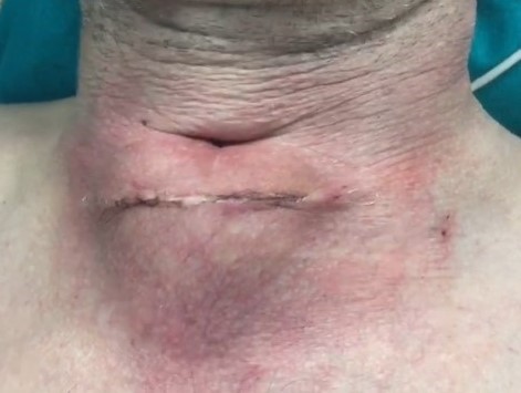 Imagen 1: Tumoración bajo la incisión de cervicotomía anterior que aumenta con el Valsalva con posterior desarrollo del eritema que se aprecia.