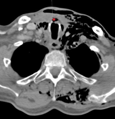 Imagen 2: Solución de continuidad (2-3 mm) en la cara anterior traqueal entre el cartílago cricoides y el primer anillo traqueal (ver asterisco) con extenso enfisema subcutáneo y burbuja adyacente.