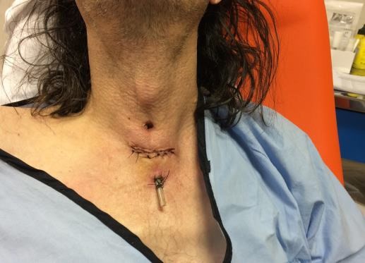 Imagen 3: Paciente con dren antes del alta hospitalaria. Se aprecia cómo ha sido sustituido por uno sin aspiración y por encima de la herida la herida retraída del orificio cutáneo de la traqueostomía antigua.