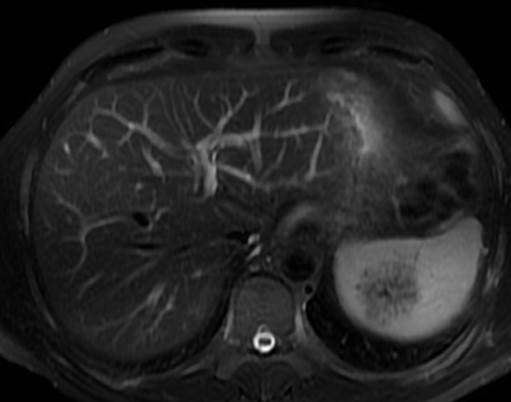 Figura 1. RMN: se aprecia lesión esplénica, sólida de aspecto heterogéneo.