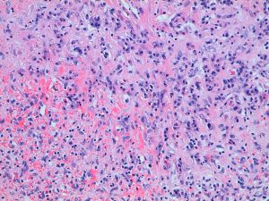 Figura 3. Aspecto microscópico: nódulos compuestos por una proliferación de estructuras vasculares con infiltrado inflamatorio de tipo mixto.