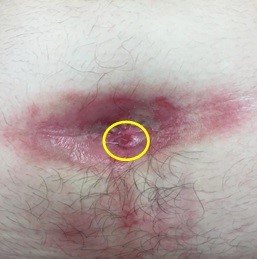 Imagen 1. se objetiva lesión de piel umbilical y orificio fistuloso (circulo amarillo).