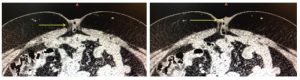Imagen 2. TC: se visualiza asa intestinal en hernia umbilical fistulizada a piel umbilical (flecha amarilla).