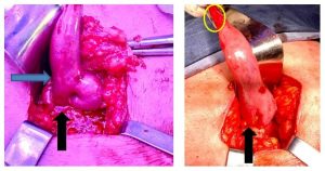 Imágenes 3 y 4. Se visualiza divertículo de Meckel de base amplia (flecha azul) y en su sector distal trayecto fistuloso a piel (circulo amarillo). Protruyendo por orificio herniario asa intestinal (flecha negra).