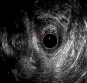 Imagen 1: Ecografía endorrectal: tumoración pararrectal derecha que se extiende hasta rama derecha del puborrectal de 3,5×2,5 cm.
