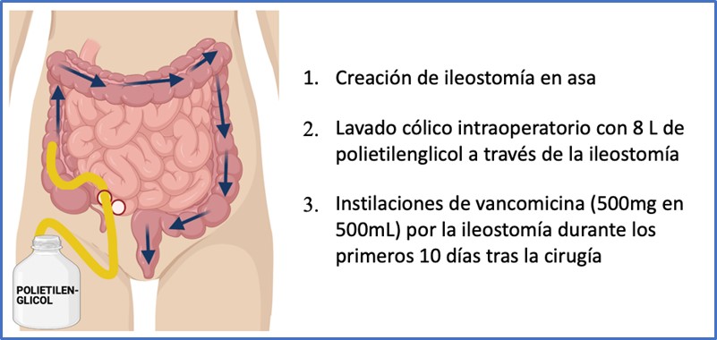 En el postoperatorio se realizan instilaciones de vancomicina (500mg en 500ml de solución Ringer Lactato) a través del asa eferente de la ileostomía 3 veces al día durante 7-10 días y se administra metronidazol intravenoso concomitante (49).