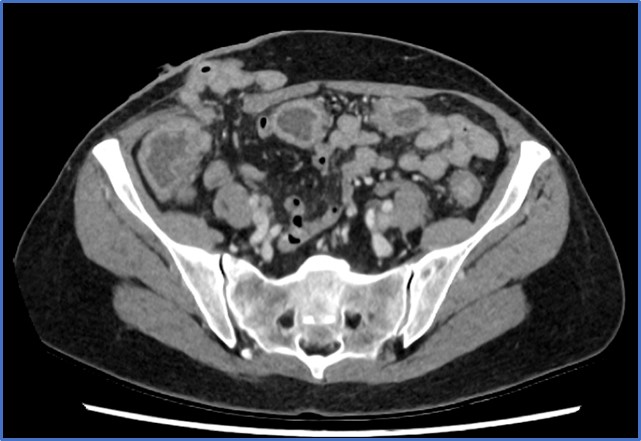 Imagen 1: Imagen de TC de paciente con ileostomía que desarrolló infección por CD en la que se observa el “signo del halo” o “signo de la diana”.