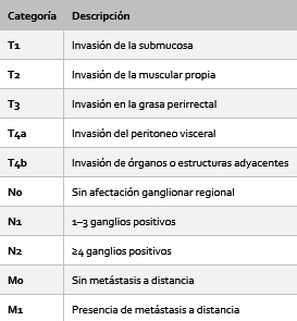 La clasificación TNM del cáncer de recto permite determinar la profundidad de la invasión tumoral y su extensión ganglionar o metastásica, y es el principal sistema utilizado en la toma de decisiones terapéuticas (Tabla 1).
