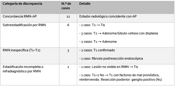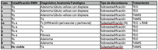 Para una mejor visualización de los casos discordantes, se presenta a continuación la relación detallada entre la estadificación por RMN, el diagnóstico anatomopatológico definitivo, el tipo de discordancia y el tratamiento recibido (Tabla 4).