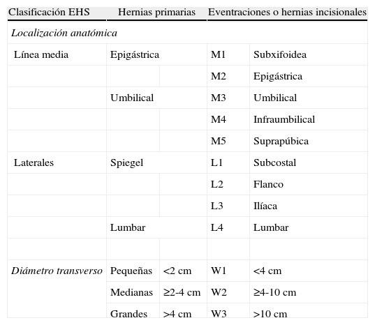 Tabla 1: Clasificación EHS eventraciones según localización y tamaño.